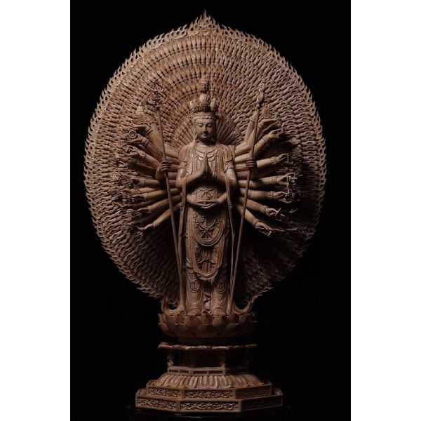 Bồ Tát Thiên Thủ Thiên Nhãn là vị Bồ tát có nghìn mắt, nghìn tay, mỗi bàn tay của Ngài đều có con mắt trí tuệ có thể nhìn thấy, nghe thấu trăm cõi, soi tỏ bốn phương tám hướng, dùng năng lực tấm lòng từ bi của mình để cứu khổ cứu nạn, độ hóa chúng sanh. Tôn tượng Bồ Tát Thiên Thủ Thiên Nhãn cao cấp chuẩn thờ gỗ lão sơn đàn hương Ấn Độ quý hiếm.
