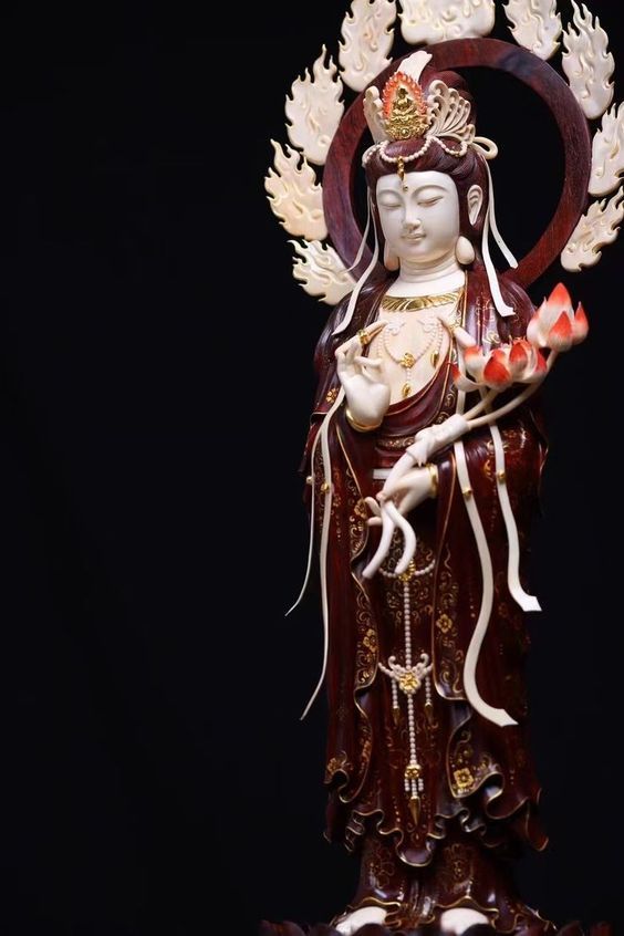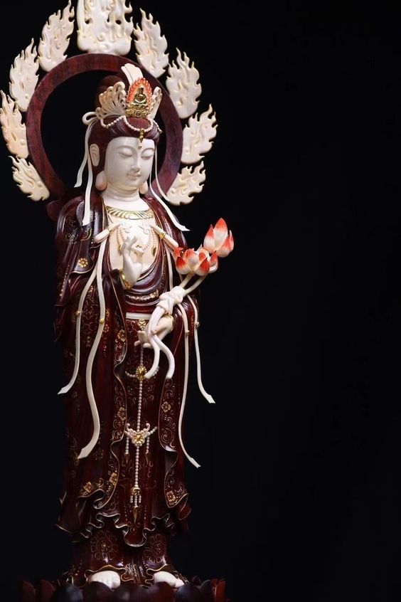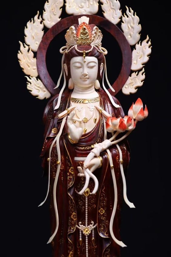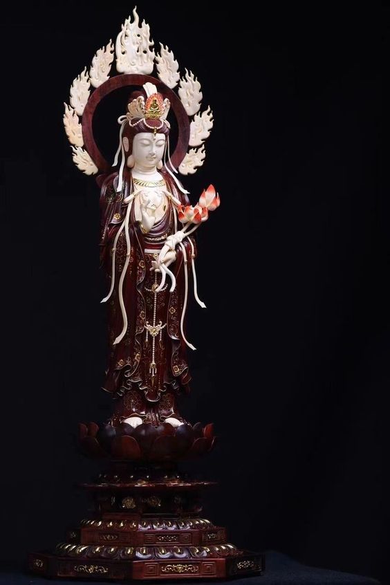 Tôn tượng Bồ Tát Đại Thế Chí cao cấp chuẩn thờ được nghệ nhân điêu khắc trên gỗ quý tử đàn tiêu diệp Ấn Độ mix Ngà Mamut băng chủng.